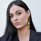 BY ARIS STAPLES The Eirene Triangle earrings feature asymmetrical design, with hand-cut triangle shapes. Each earring is pieced together by our master, Aris, to create this pair loved by so many.