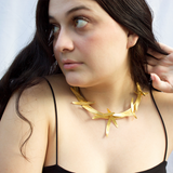 Each necklace is made from brass olive leaves, carefully soldered in an asymmetrical pattern on a bold flat chain that lays beautifully along the neckline. It’s lightweight, striking, and gives off a true goddess vibe, all while being incredibly comfortable to wear.