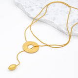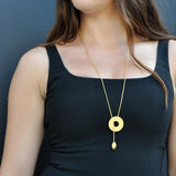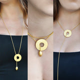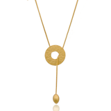Make an impression with our Aja lariat necklace, designed to be worn at different lengths. The long lariat necklace is made with a hand-hammered adjustable round pendant that can be adjusted along a 32" chain. The easy-to-wear necklace wraps around the neck to show off your favorite neckline and is perfect for any occasion.