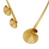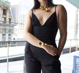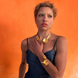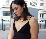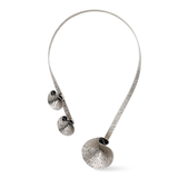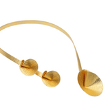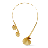 Upon completing this distinctive collar necklace, I was reminded of the powerful Goddess Athena and her iconic shield, hence the name. The shield was more than just a means of defense for her - it was a symbol of her authority and might, often instilling fear in those who opposed her. Every necklace is hand-cut from brass, featuring a pattern of hammered lines and securely attached to a solid collar. The finishing touch involves sandblasting and plating it with 18K gold. This necklace is also offered in oxidized silver. Please note that each piece is one-of-a-kind, and may vary slightly from others.
