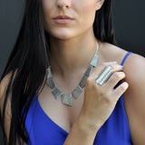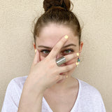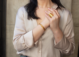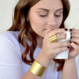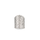 A wide hammered ring with texturized metal detail and distinct cylinder design on top. A great pair with our matching cuff bracelet. Pair with a beautiful white maxi dress for the ultimate Grecian goddess feel.