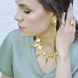 The goddess of the dawn, Eos arises at twilight to release the sun and is often depicted as riding in a golden chariot drawn by winged horses or flying with her own pair of feathered wings. These beautiful statement earrings are handcrafted with textured 18k gold plated brass and are available in pure silver finish. Wear them on a night out to top off your look.